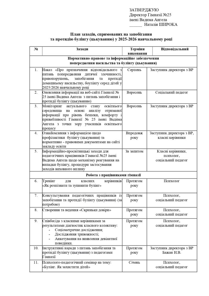 План заходів по протидії булінгу на 2025-2026 навчальний рік