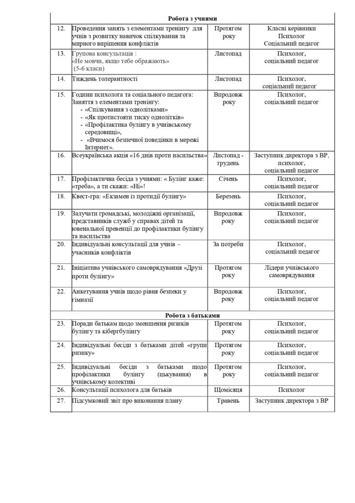 План заходів по протидії булінгу на 2024-2025 навчальний рік