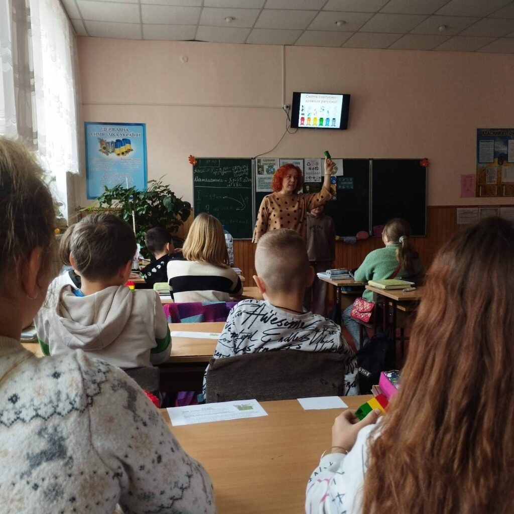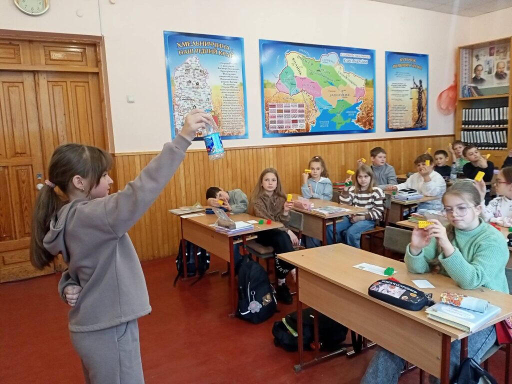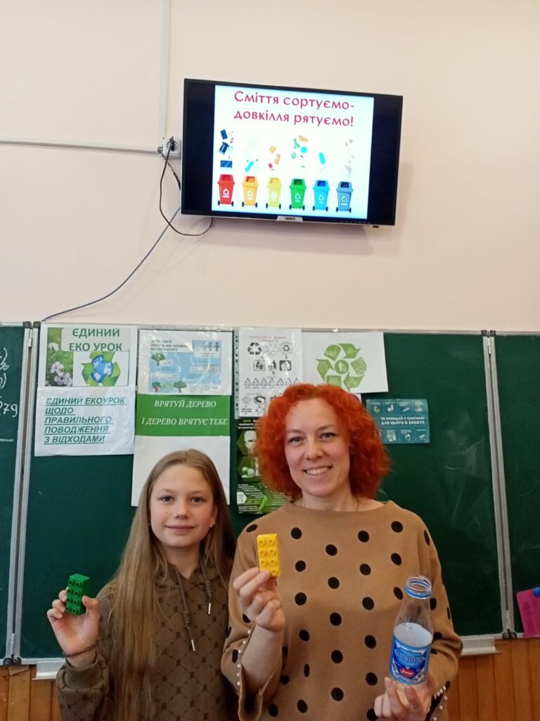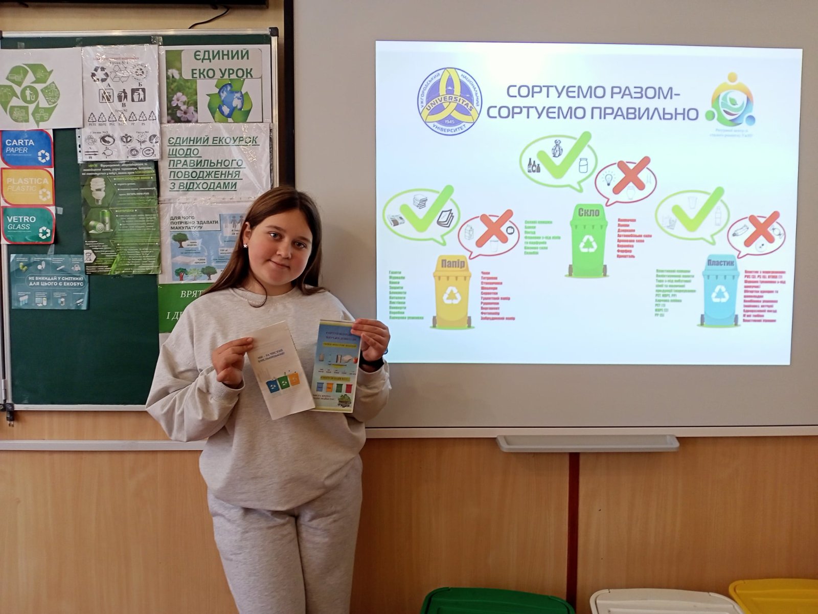 З метою привернення уваги учнів до екологічних проблем людства та розвитку відповідального ставлення до сортування та переробки сміття, вчитель хімії Гімназії №25 імені Вадима Ангела – Мацьків Ірина Федорівна провела у 5-7-х класах “Єдиний екологічний урок щодо правильного поводження з відходами”.