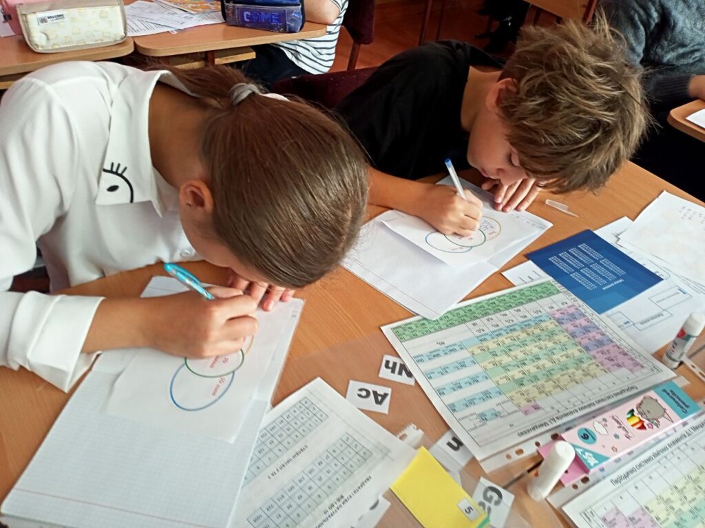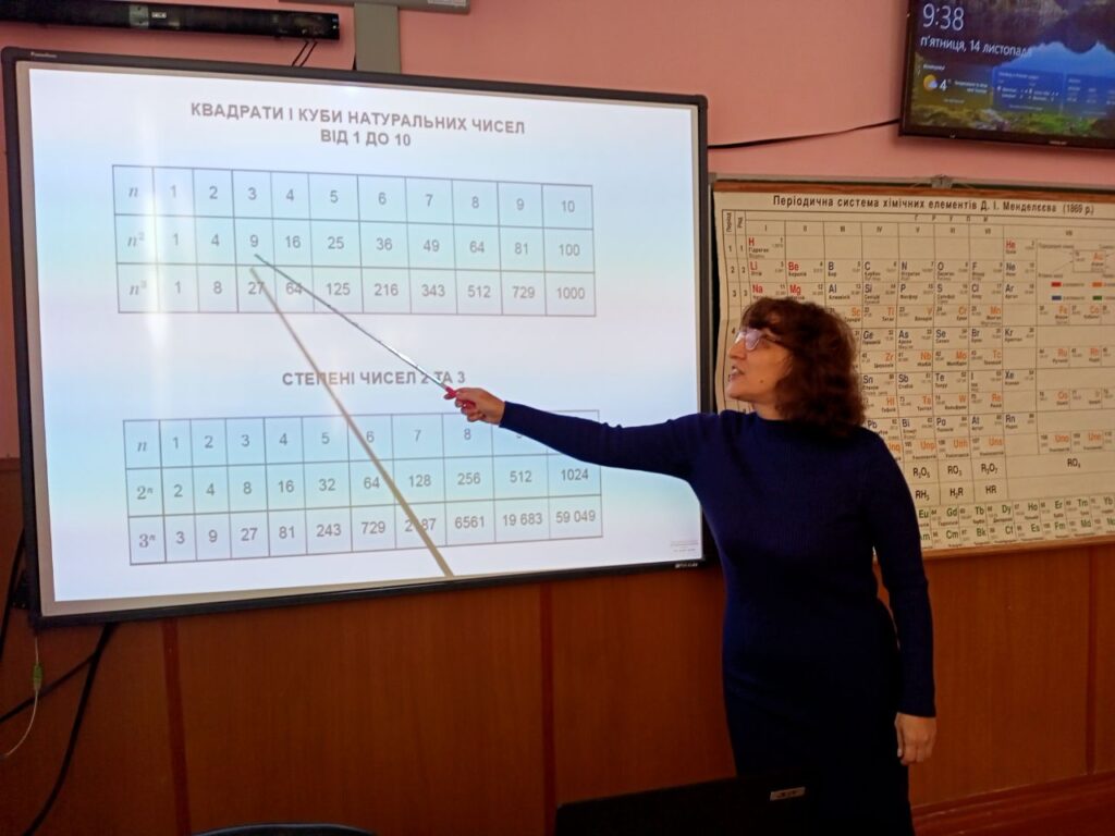 Гімназисти із задоволенням працювали в парах і групах ; використовували таблиці квадратів та кубів і таблиці степенів з основами 2 і 3. Також учні шукали відповідність між значеннями виразів, що містять степені, порядковими номерами хімічних елементів, назвами елементів та їх розміщенням в періодичній таблиці Д.І Менделєєва.