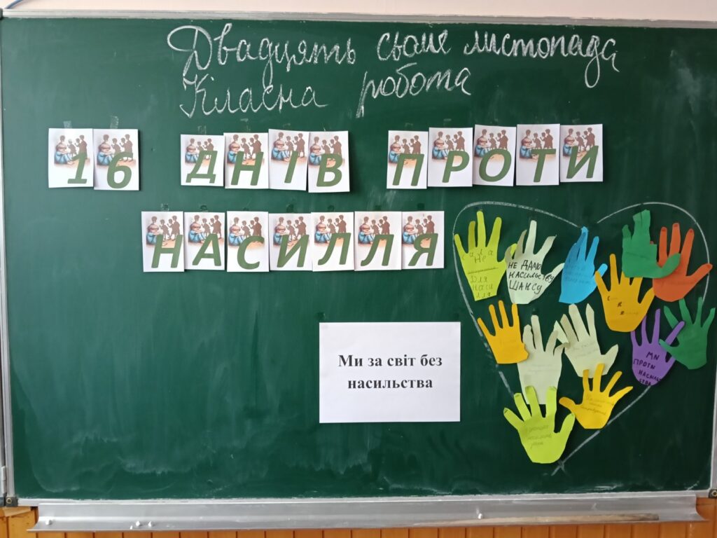 25 листопада по всьому світу щорічно розпочинається Акція 16 днів проти насильства. Стартувала вона і у нашому закладі. Перші дні акції були присвячені одній з найбільших проблем сучасності – насильству. Соціальний педагог Олена Котнюк провела з учнями 5-7 класів виховні заходи, метою яких було підвищити рівень обізнаності про проблему насильства та закликати до активних дій щодо боротьби з ним. Через інформаційні блоки, практичні вправи та творчі завдання учасники заходів отримали розуміння, що насильство не повинно замовчуватись, насильникам не повинно бути оправдань за жодних обставин, жертва насильства вартує життя без страху і болю… Кожен може зробити внесок у боротьбу з насильством. Разом ми сильніші!
