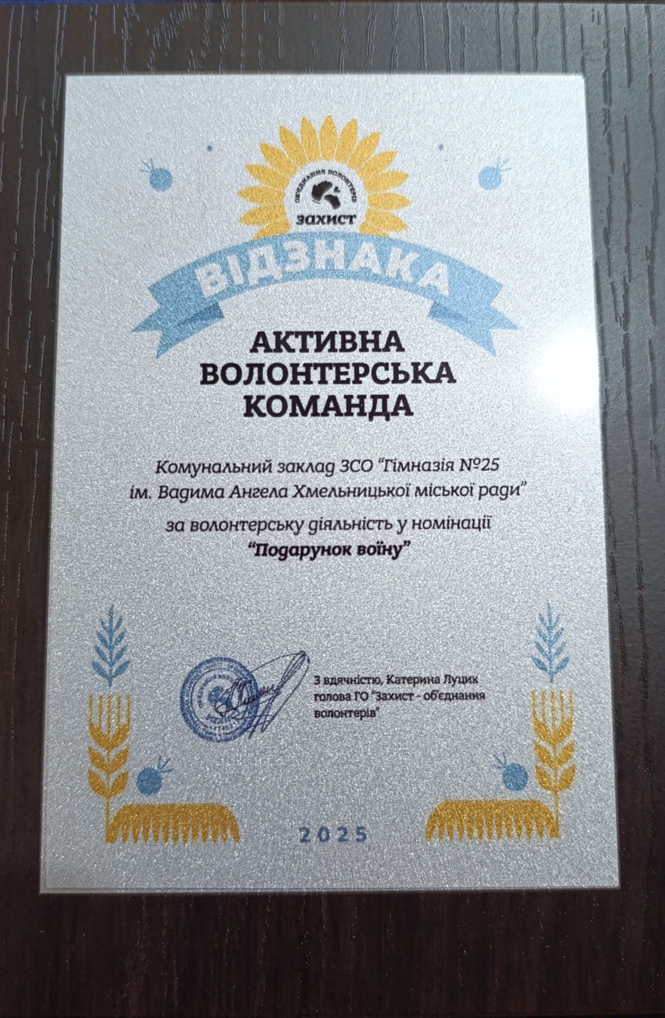 Гімназія № 25 імені Вадима Ангела отримала відзнаку в номінації “Активна волонтерська команда” від ГО “Захист – об’єднання волонтерів”