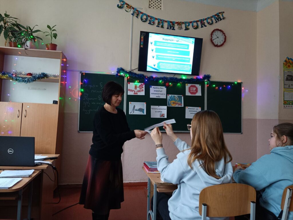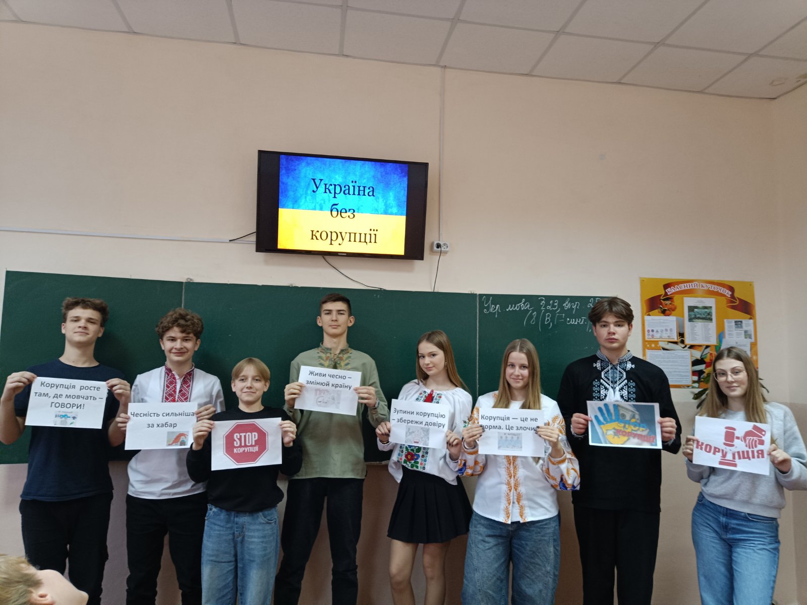 Дев’ятикласники аналізували різні життєві ситуації, визначали можливі прояви корупції та обговорювали, чому такі дії є небезпечними для суспільства. Учні долучилися до інтерактиву «Міфи та факти про корупцію», де мали можливість розвінчати поширені омани та отримати корисні знання у цікавій формі, презентували яскраві та влучні слогани, підкреслюючи важливість чесності, відповідальності та справедливості.