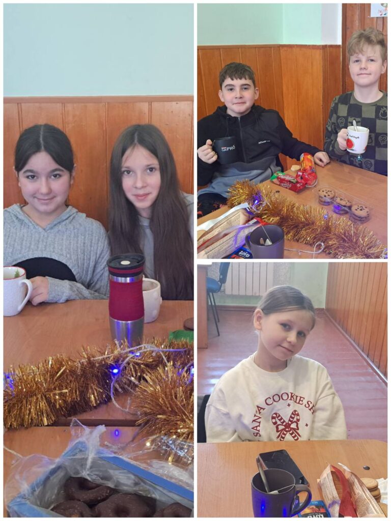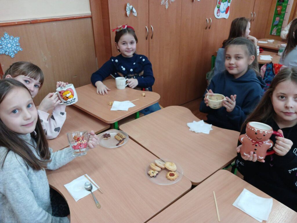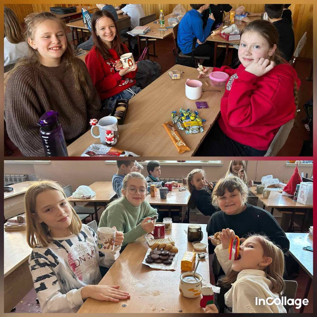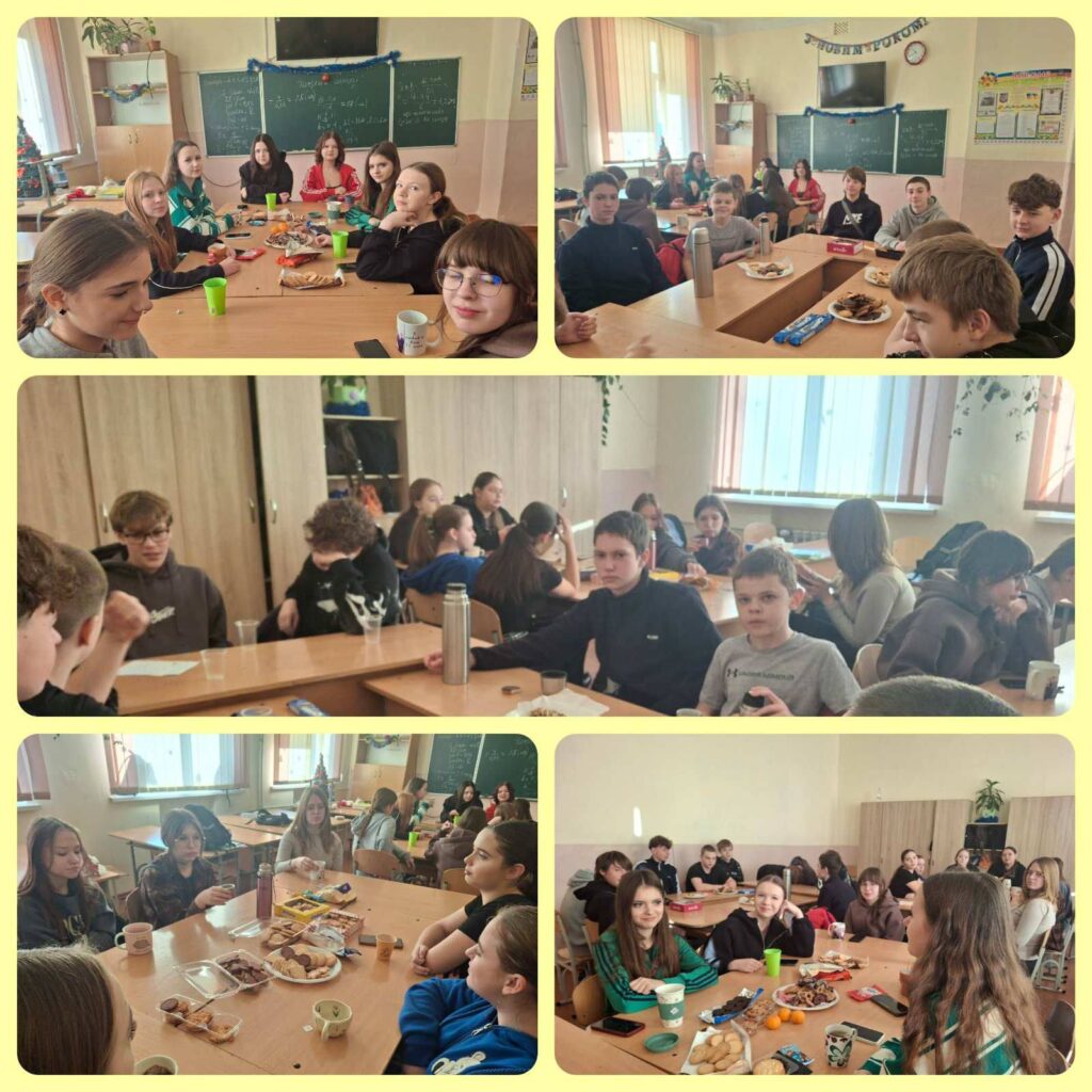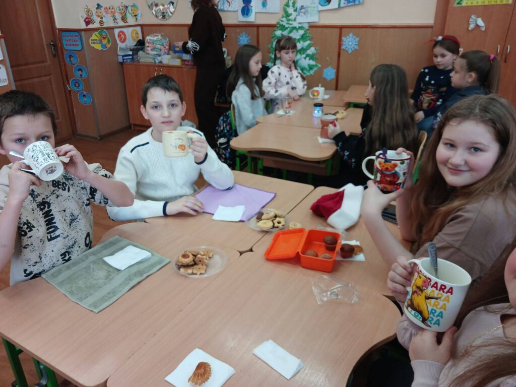 У четвертий день Тижня новорічного настрою у класах учні об’єднали столи, виклали на них солодощі, налили у свої чашечки з чаєм кип’ятку і насолоджувалися смаком печива, цукерок й сімейною святковою атмосферою чаювання.