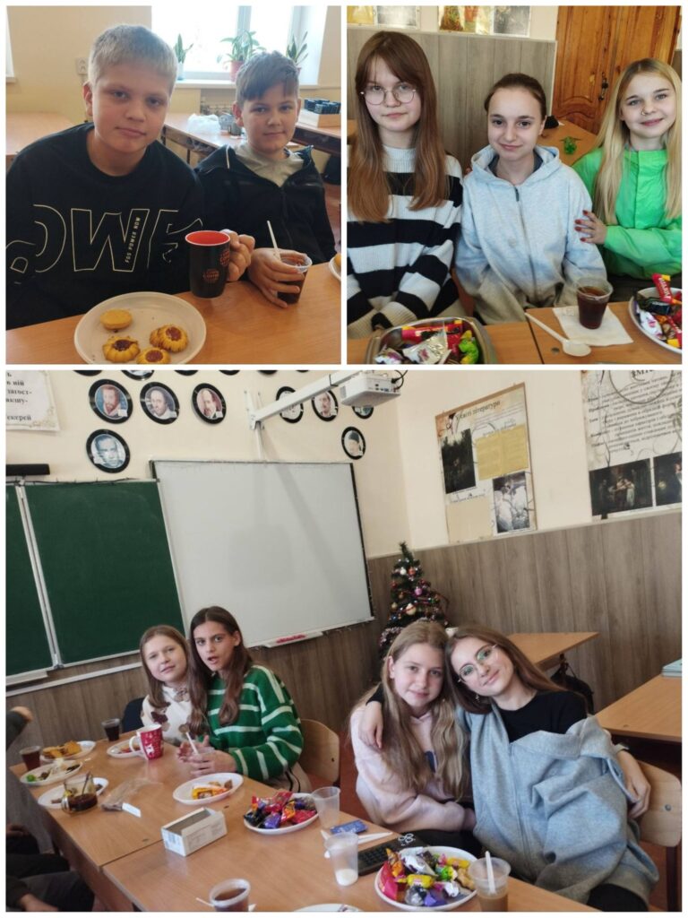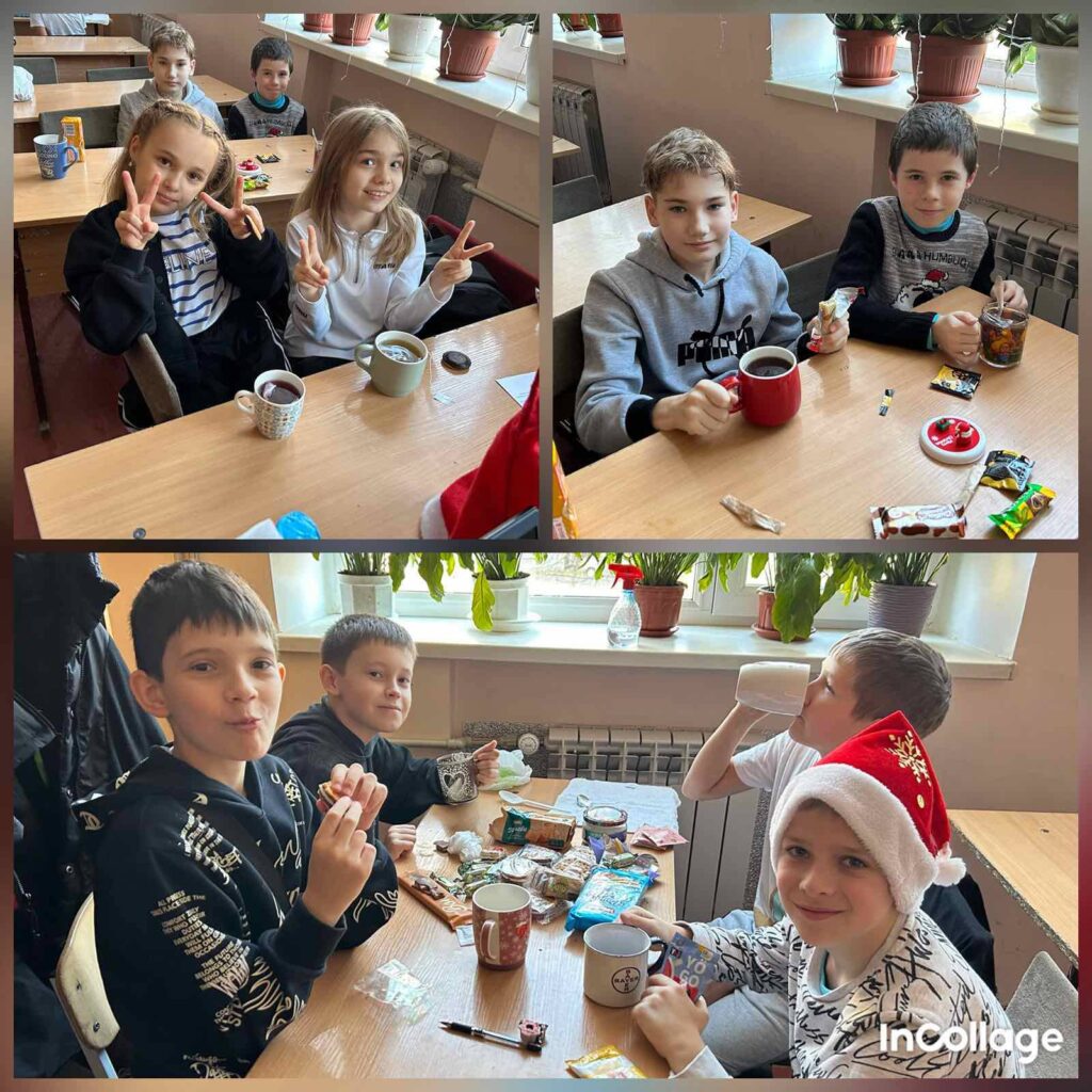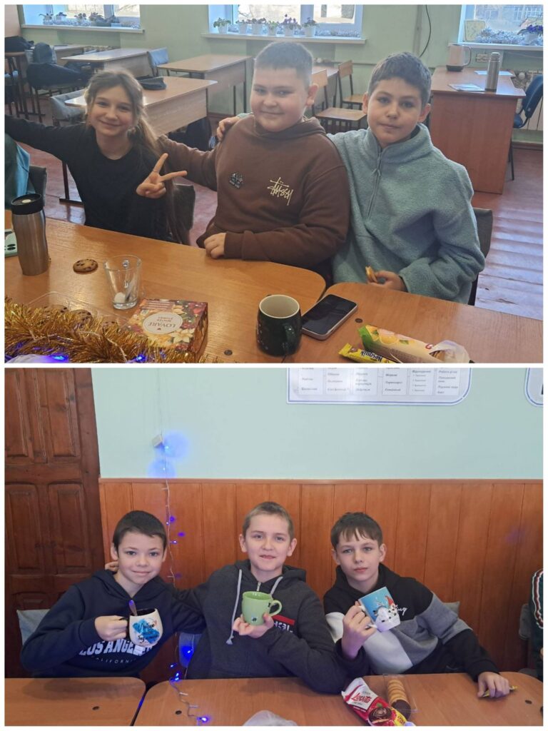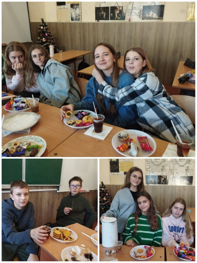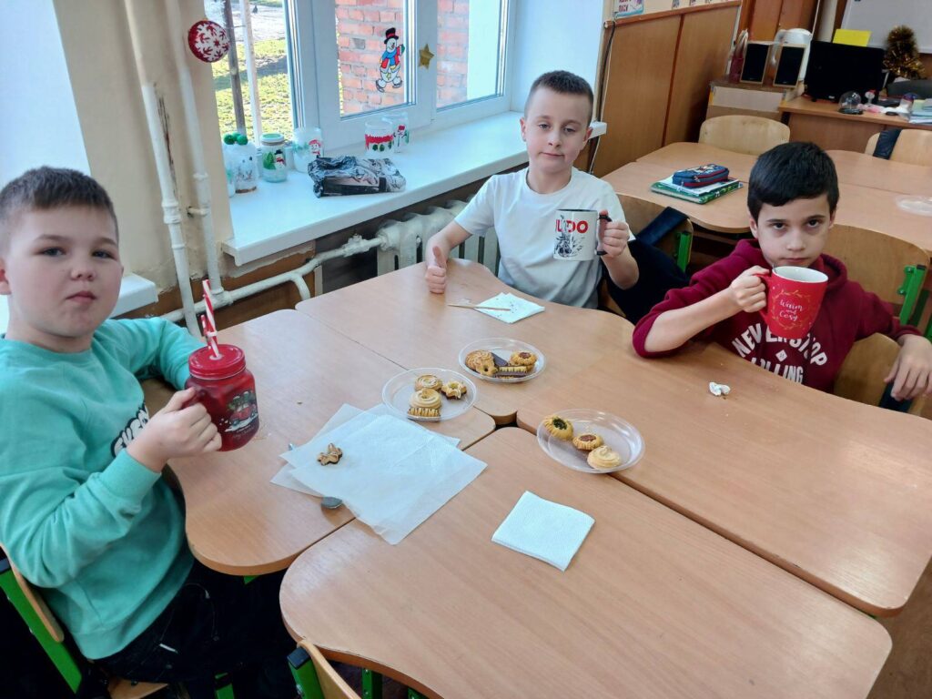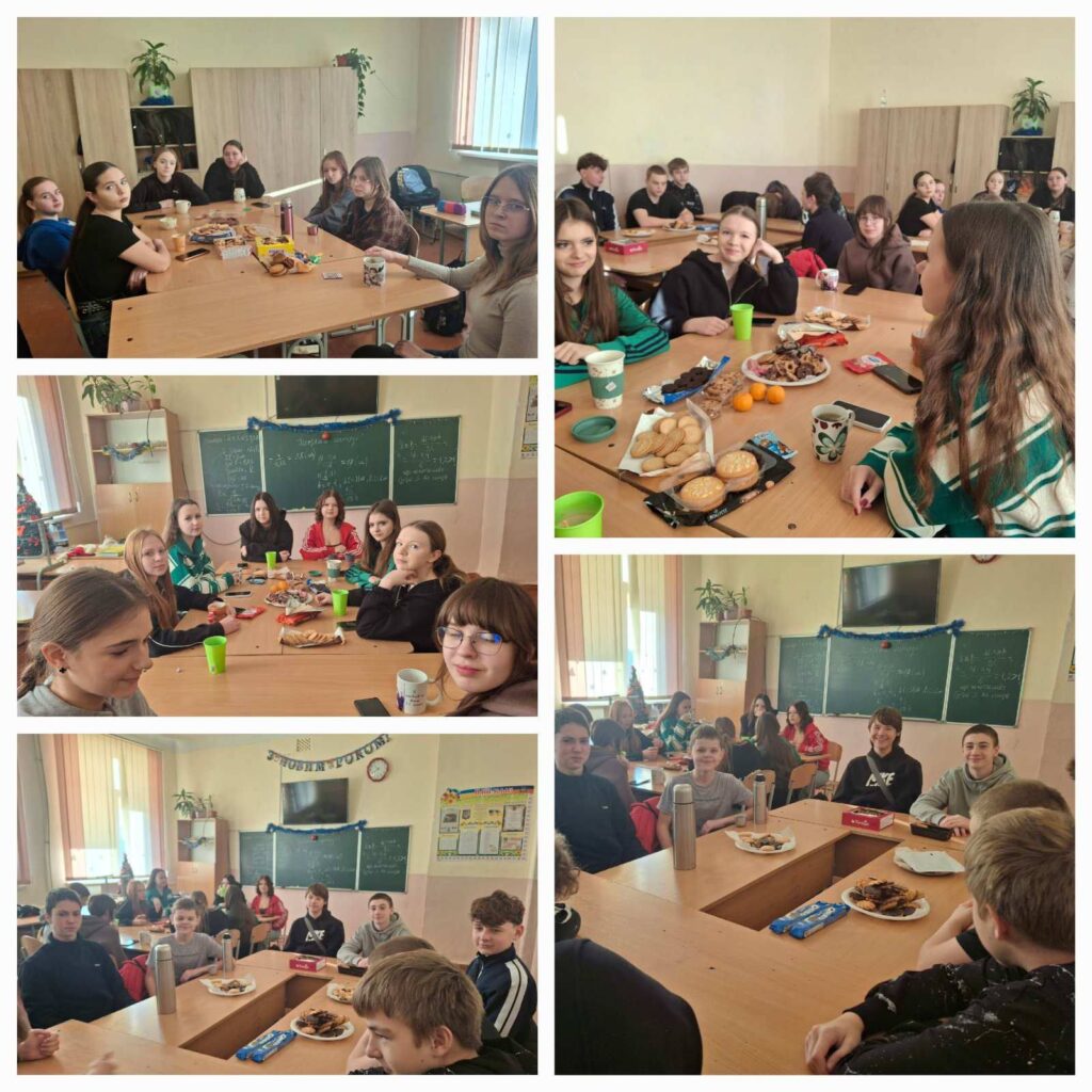 У четвертий день Тижня новорічного настрою у класах учні об’єднали столи, виклали на них солодощі, налили у свої чашечки з чаєм кип’ятку і насолоджувалися смаком печива, цукерок й сімейною святковою атмосферою чаювання.
