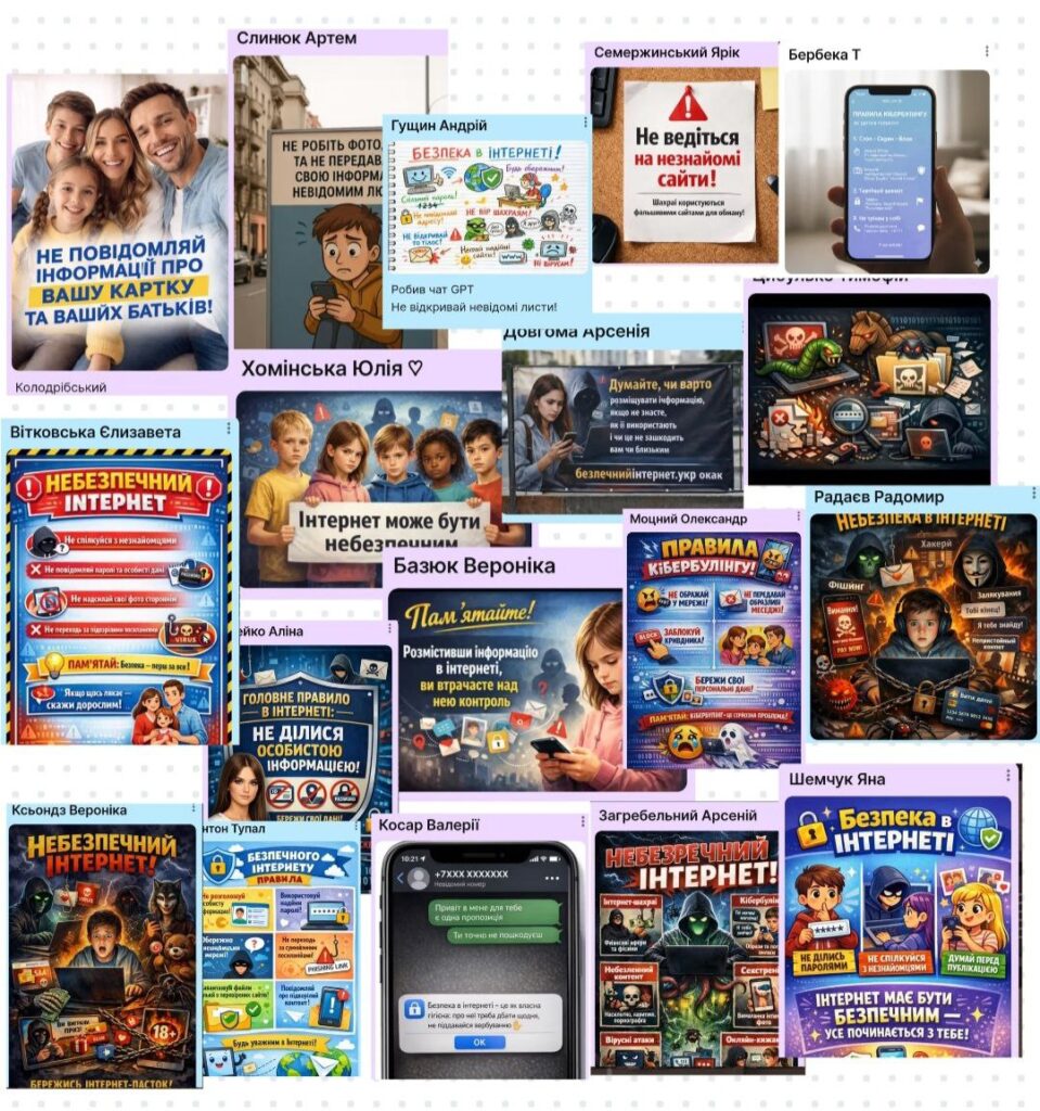 Щоб запобігти всім негативним явищам та небезпекам, які очікують в інтернеті, учні 6-х класів практикувались у правильній поведінці та безпечному користуванню сучасними інтернет-технологіями. Створювали листівки, плакати “(Не)безпечний_інтернет” за допомогою ШІ.