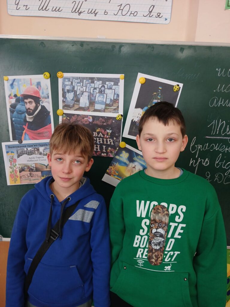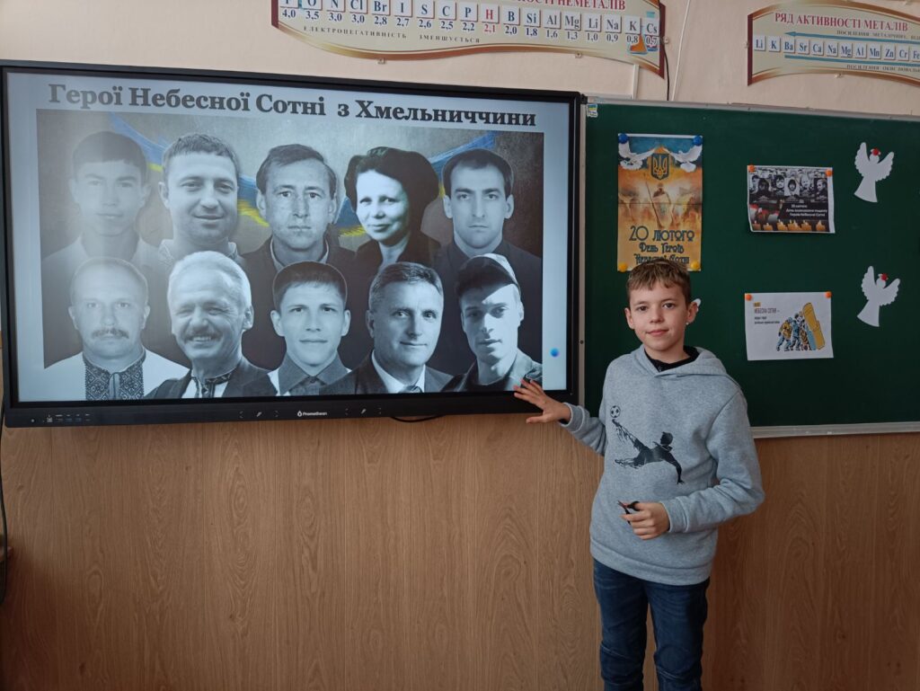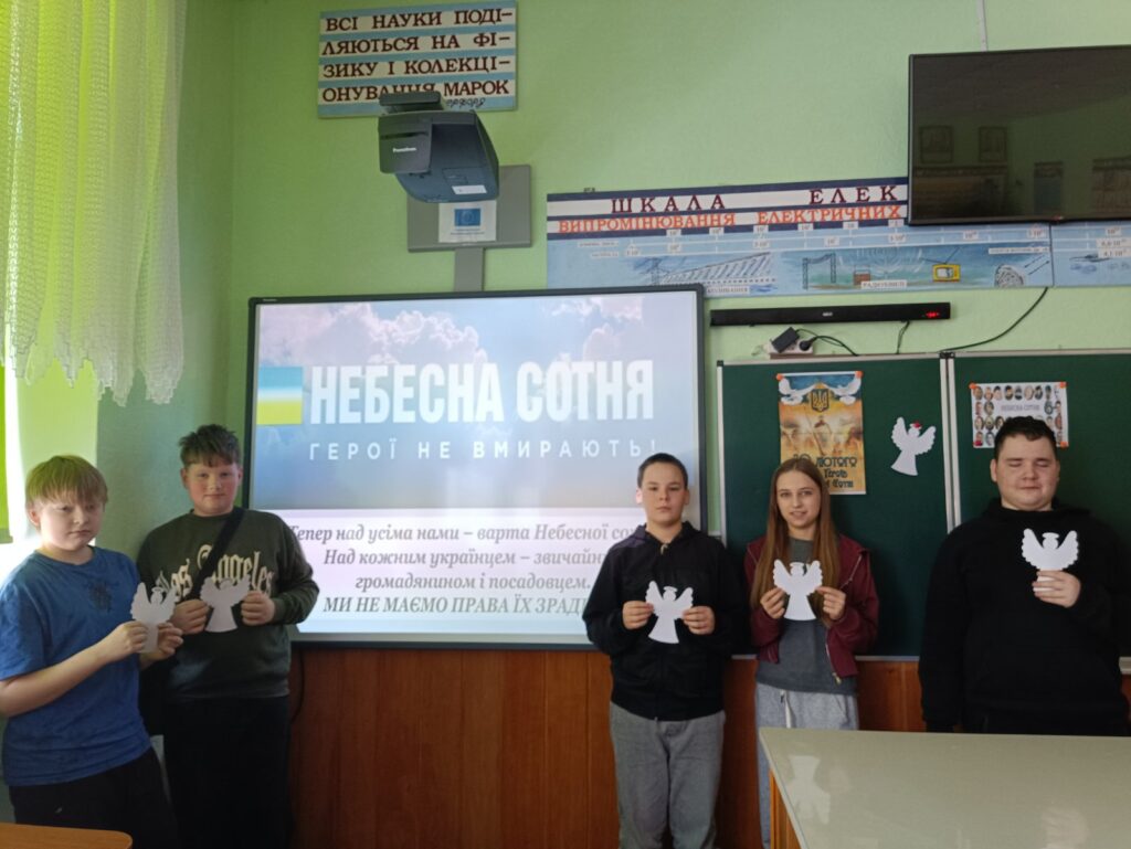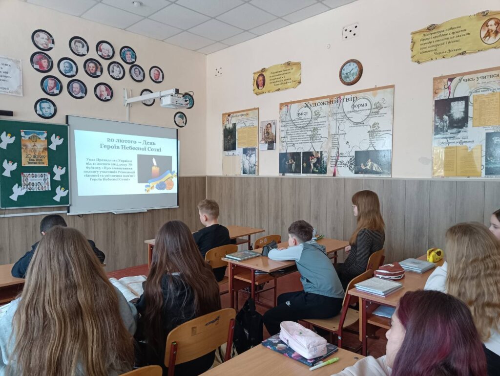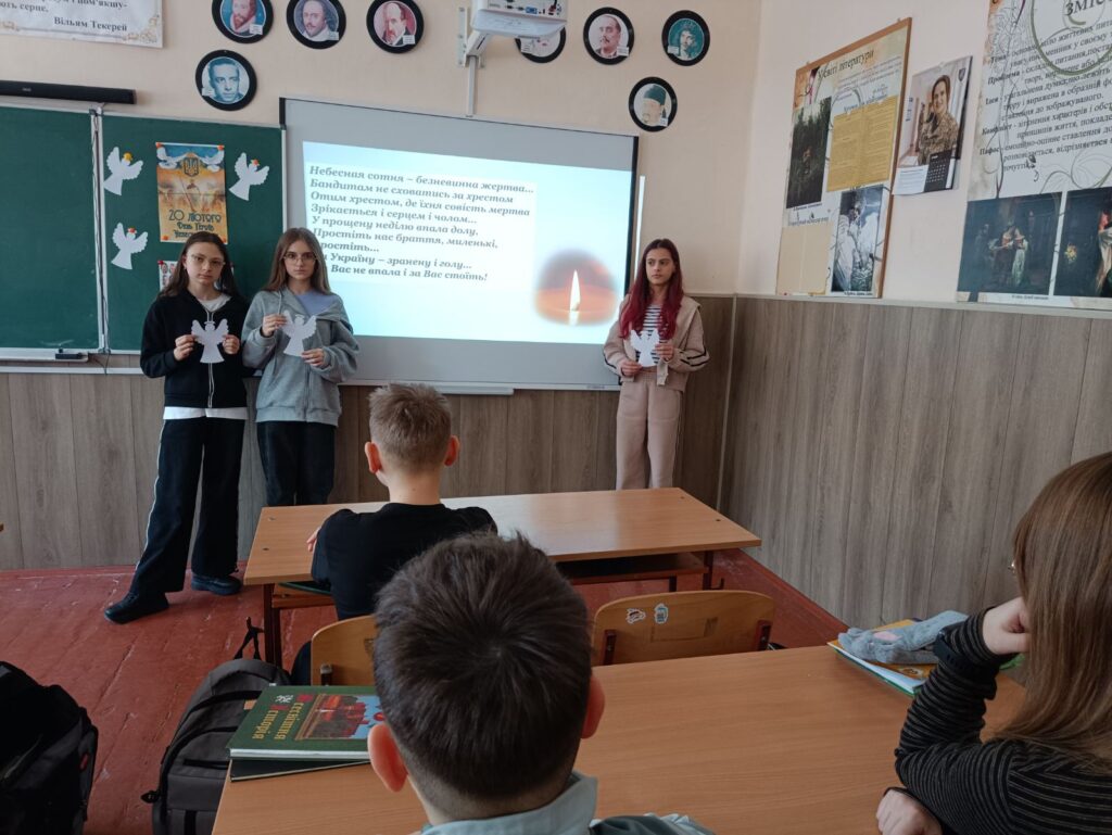 Гімназисти старшої школи проводили інформаційні хвилини для своїх однокласників, щоб пригадати хронологічні етапи революції та вшанувати хвилиною мовчання усіх загиблих протестувальників у найкривавіші дні лютого 2014 року.