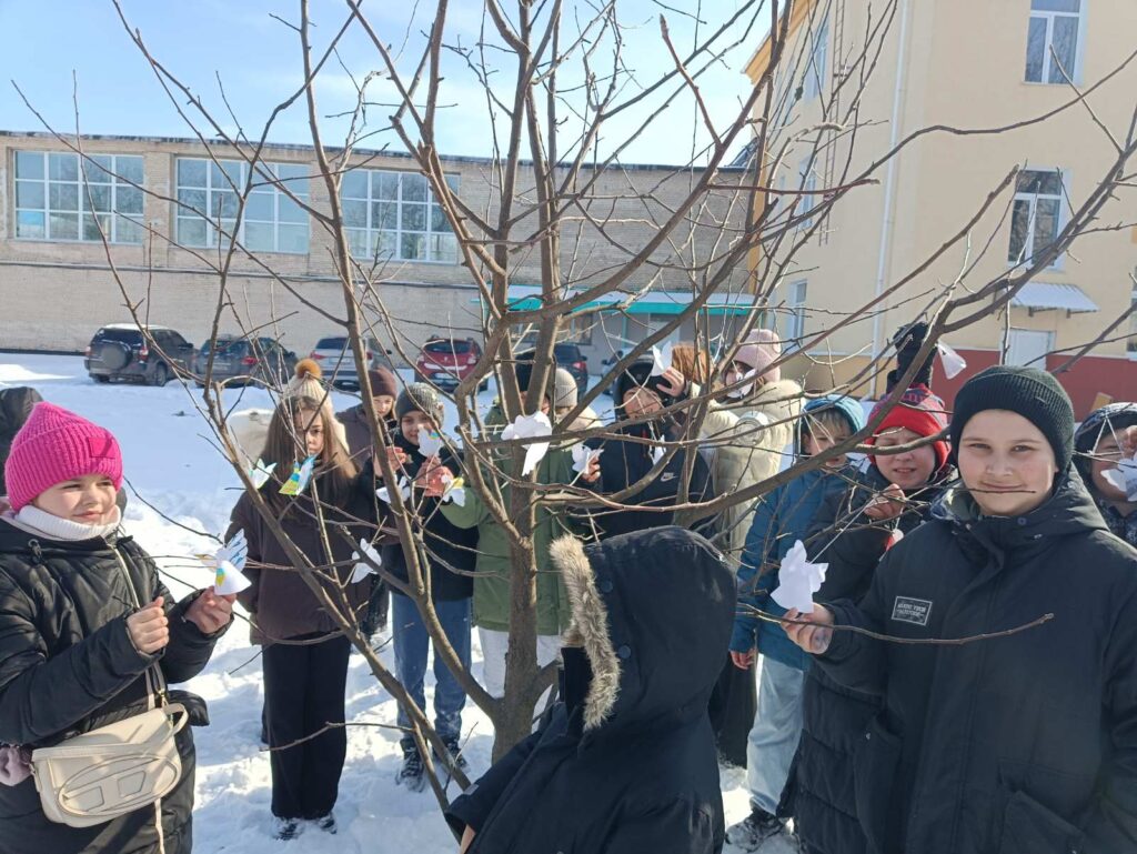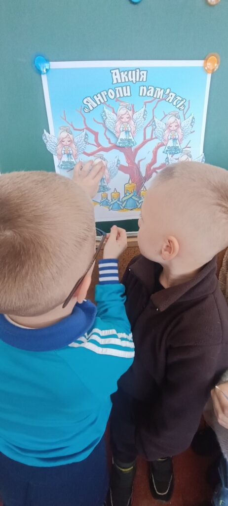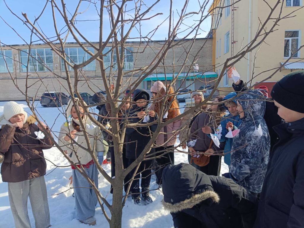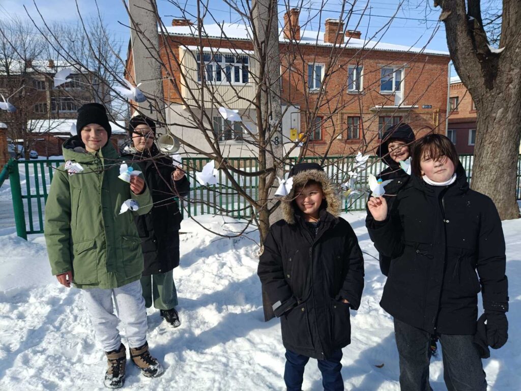 Учні 5- А класу разом з класним керівником Жарковою Наталією Володимирівною долучилися до міської акції “Ангели пам’яті” та розвішали білі паперові янголи на гіллі яблуні шкільного саду, щоб і мешканці мікрорайону згадали наших Героїв Небесної Сотні у ці пам’ятні дні.